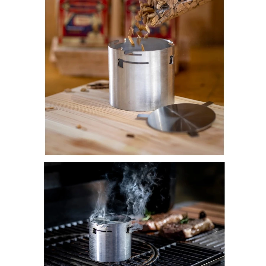 Eenvoudig in gebruik: Vul de beker tot de helft, sluit het deksel, plaats hem op het heetste deel van het rooster en sluit de barbecue. Binnen 10 minuten ontstaat een gelijkmatige, aromatische rook.