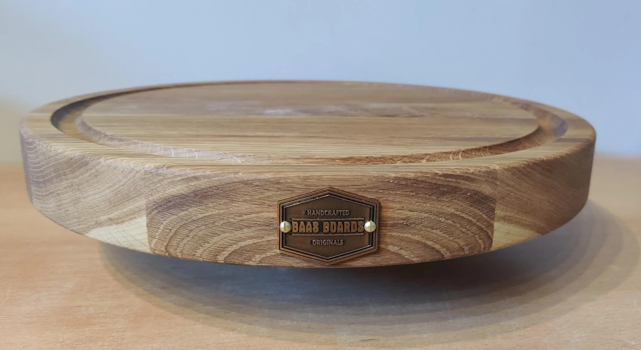 Baas Boards Snijplank Ovaal XL Eiken (49x40x4cm). Schitterende snijplank van de hoogste kwaliteit. Snijden op deze royale snijplank is een feestje, mede ook door de diepe sapgeul, zodat tijdens het snijden het vocht goed wordt opgevangen. De snijplank is voorzien van anti-slip pootjes zodat de snijplank goed blijft liggen en ook gemakkelijk op te pakken is. De snijplank is gemaakt van Europees eiken, uit duurzaam beheerde bossen.