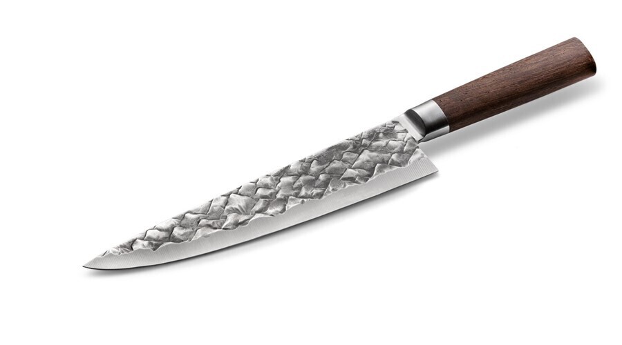 Een echt goed mes maakt van elke snijklus een plezier. Dit mes hakt moeiteloos een ui in seconden en helpt je in enkele minuten een complete salade samen te stellen. Het ruim 20cm lang koksmes is het meest veelzijdige gereedschap in elke keuken en is onmisbaar voor zowel de gepassioneerde thuiskok als een Michelin-chef.