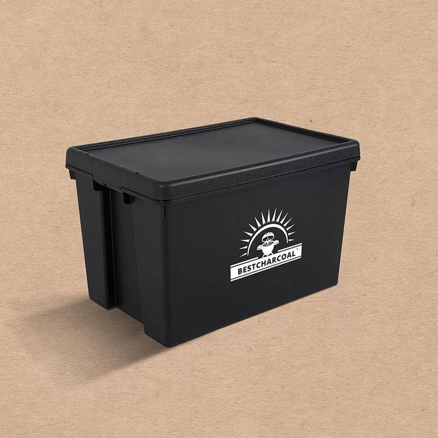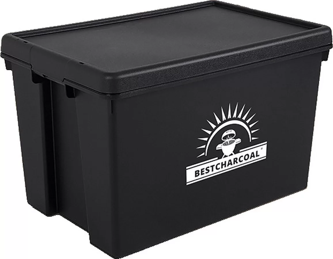 De box met deksel, heeft een inhoud van 62 liter en een draagkracht van 300 kg en is dus geschikt voor meerdere 10 of 15 kg houtskoolzakken.