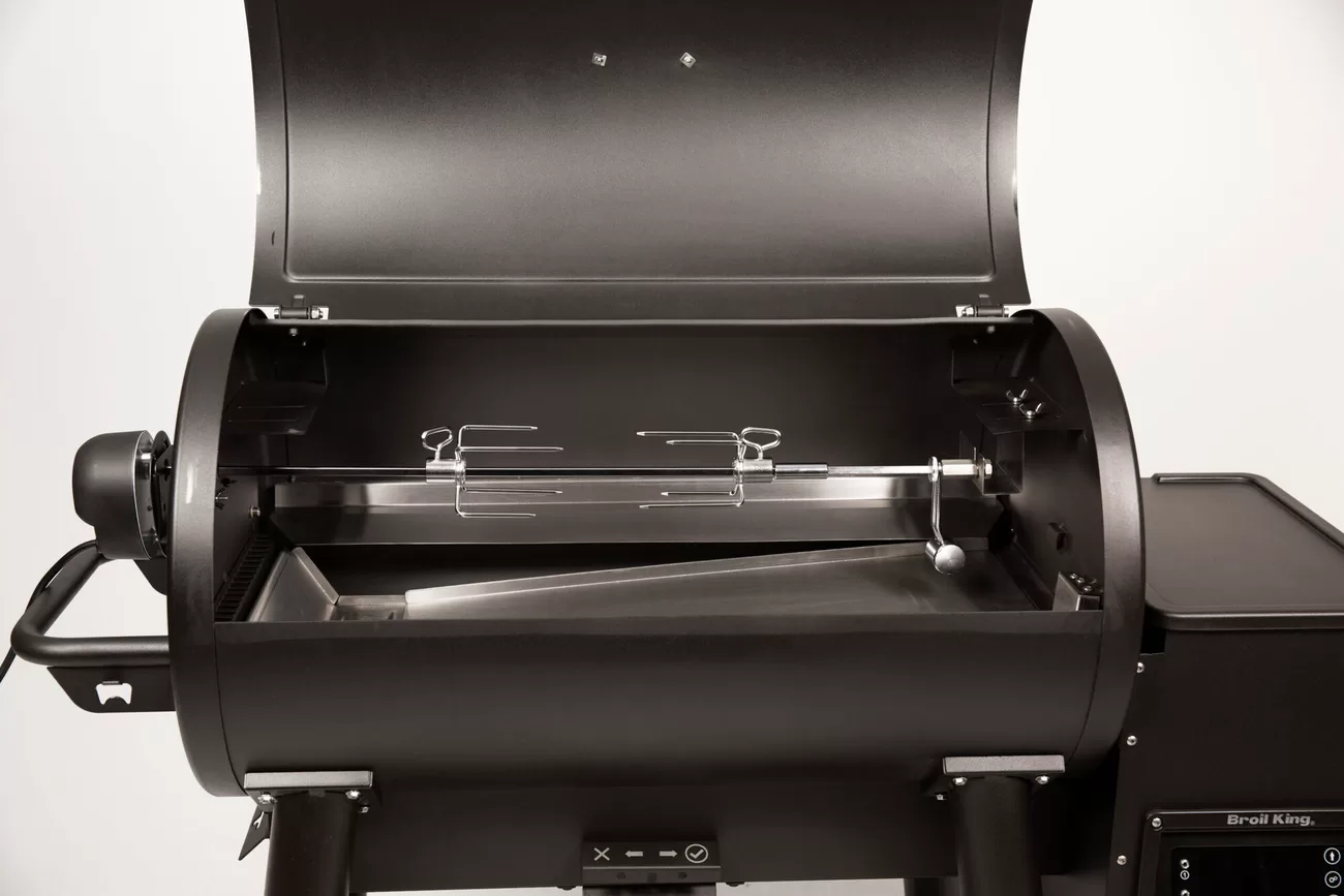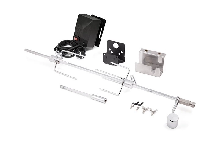 Een complete rotisserie set van Broil King voor gebruik met de Broil King Grills. Het spit wordt aangedreven op 220 volt en wordt geleverd met twee spitvorken en een contragewicht.