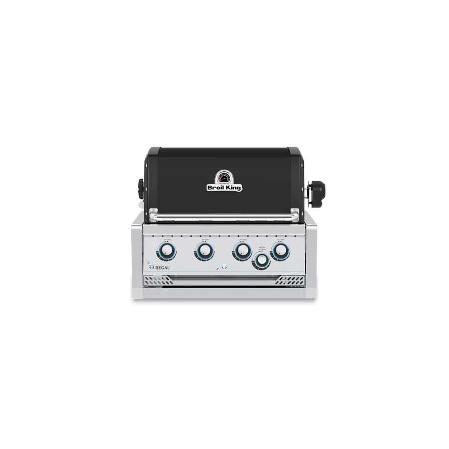 De Broil King™ Regal™ 470 zwarte inbouw gasbarbecue uit de Built In™ serie is uitgerust met 4 Dual-Tube™ roestvrijstalen branders, 4 omkeerbare geëmailleerde gietijzeren grillroosters, Flav-R-Wave™ warmteverdelers van roestvrij staal en een achterbrander met compleet draaispit
