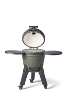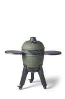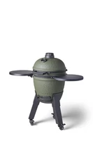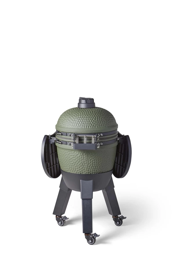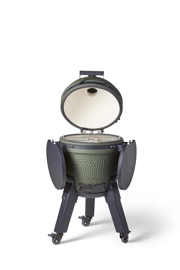Een premium matgroene kamado met een heel fraai zwart onderstel op wielen en zijtafels.