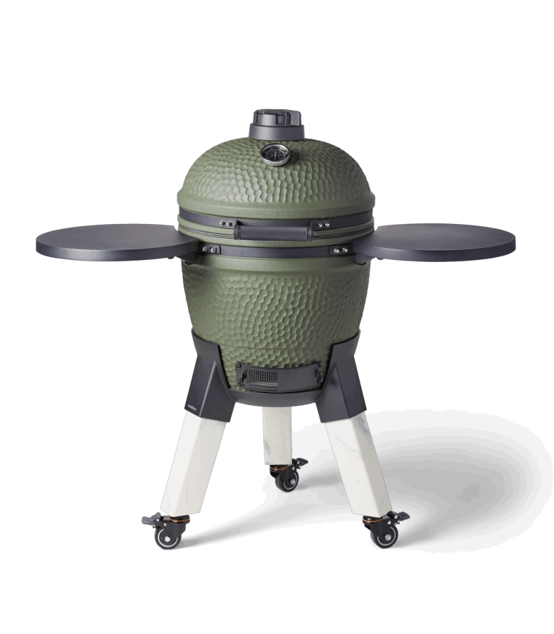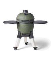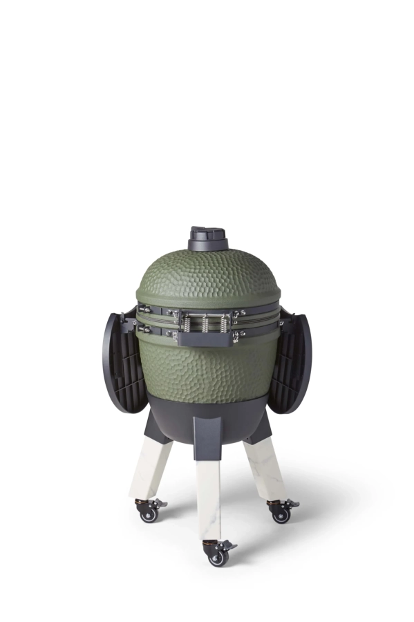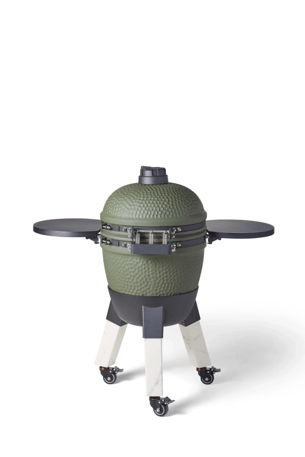 Een premium matgroene kamado met een fraai alumimium onderstel voorzien van marmerlook poten op wielen, en zijtafels.