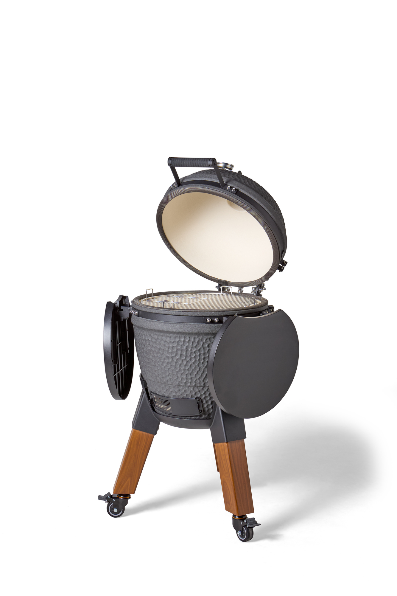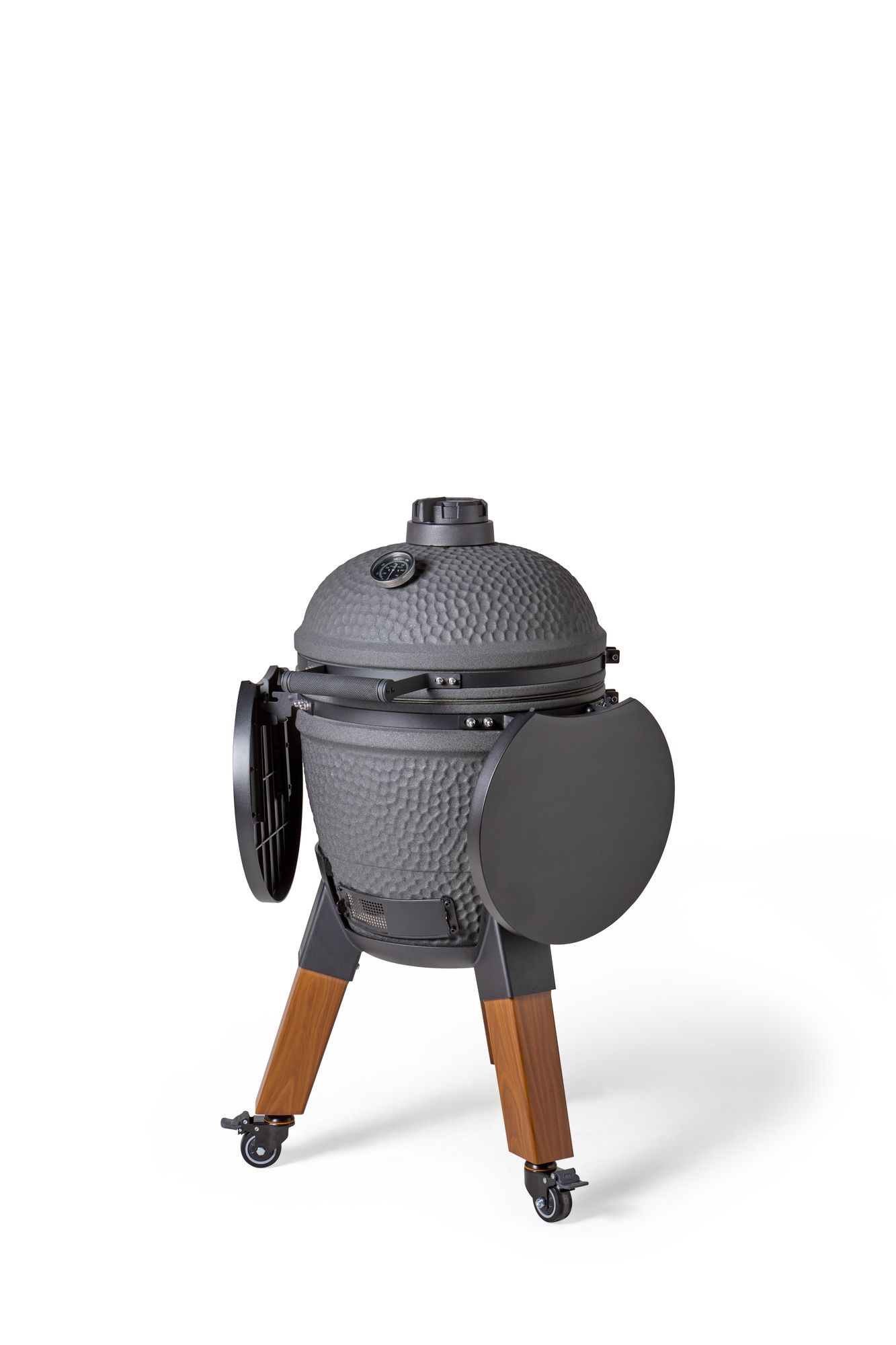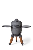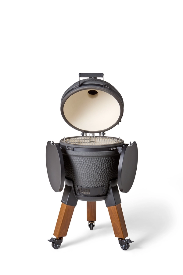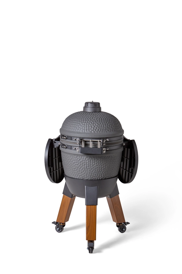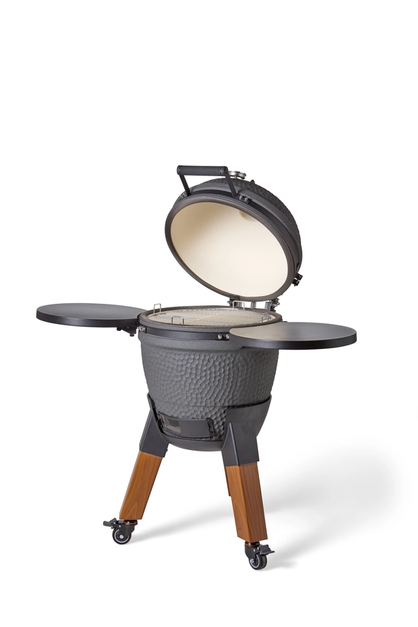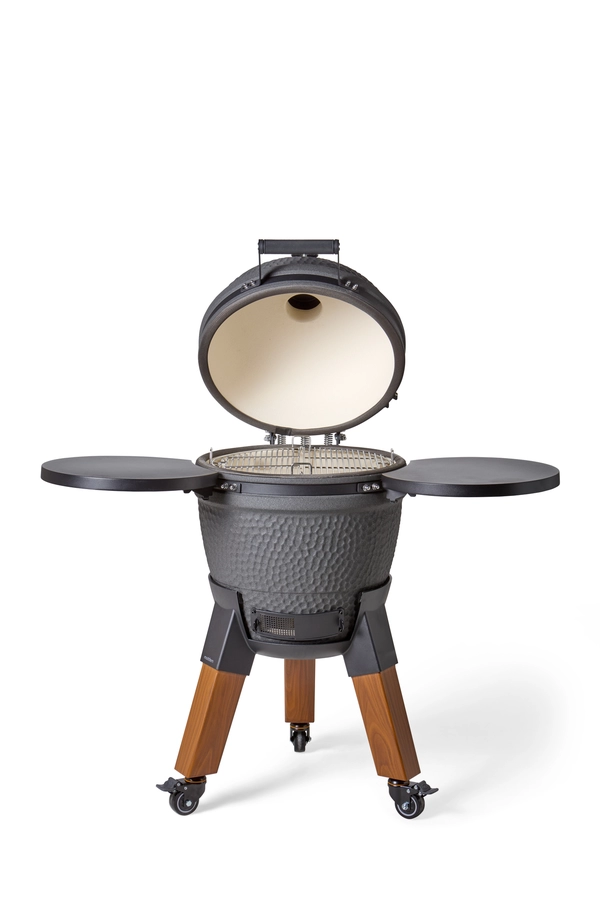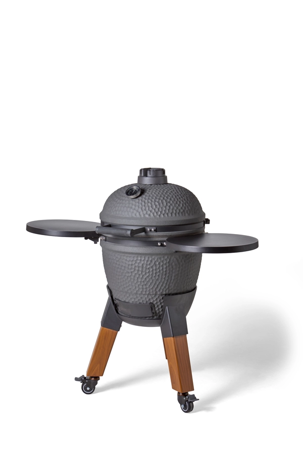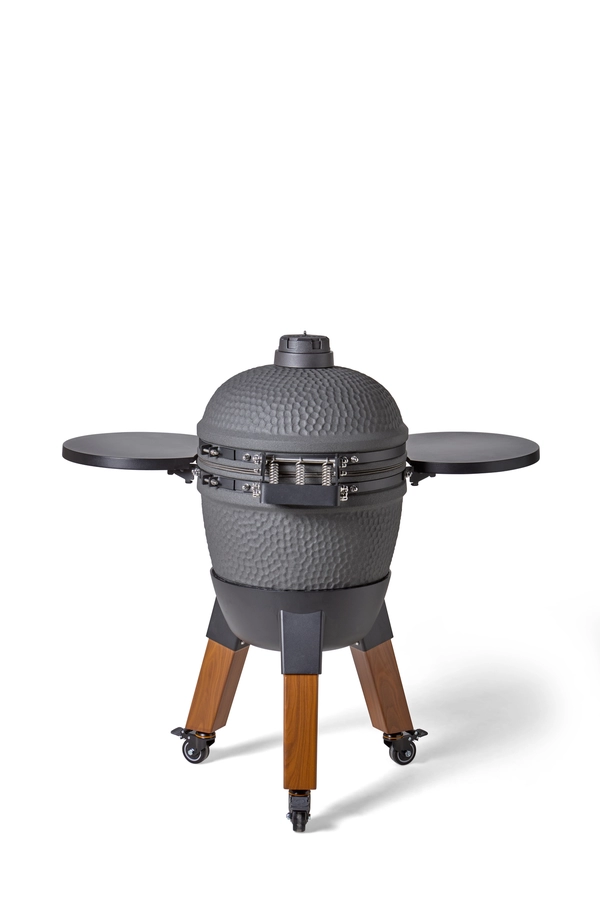 Een premium charcoal grey kamado met een heel fraai alumimium houtlook onderstel op wielen en zijtafels.