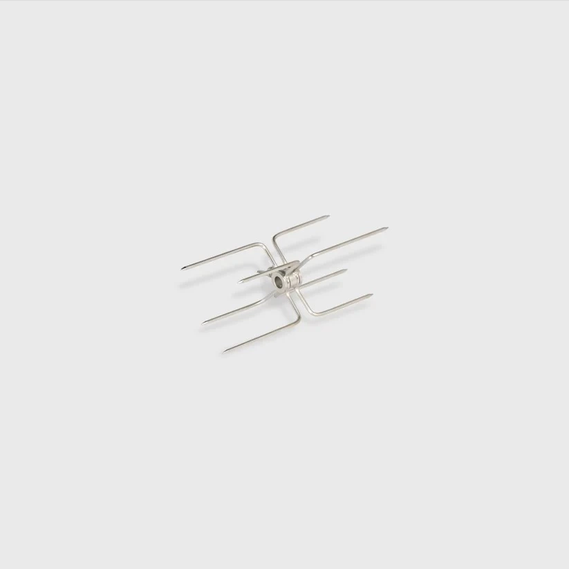 Een dubbele Spitvork, waarmee er bijvoorbeeld eenvoudig twee kippen op het spit geklemd kunnen worden.