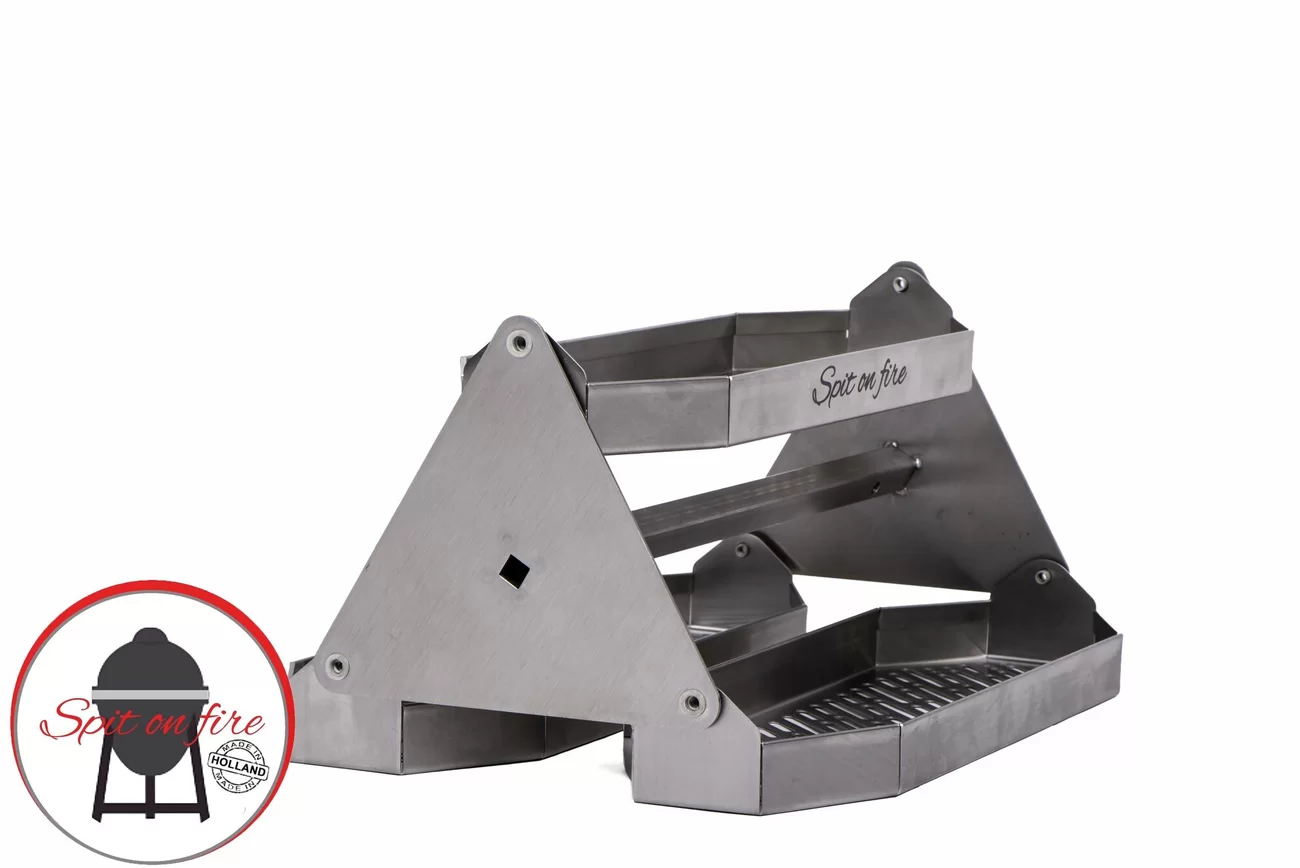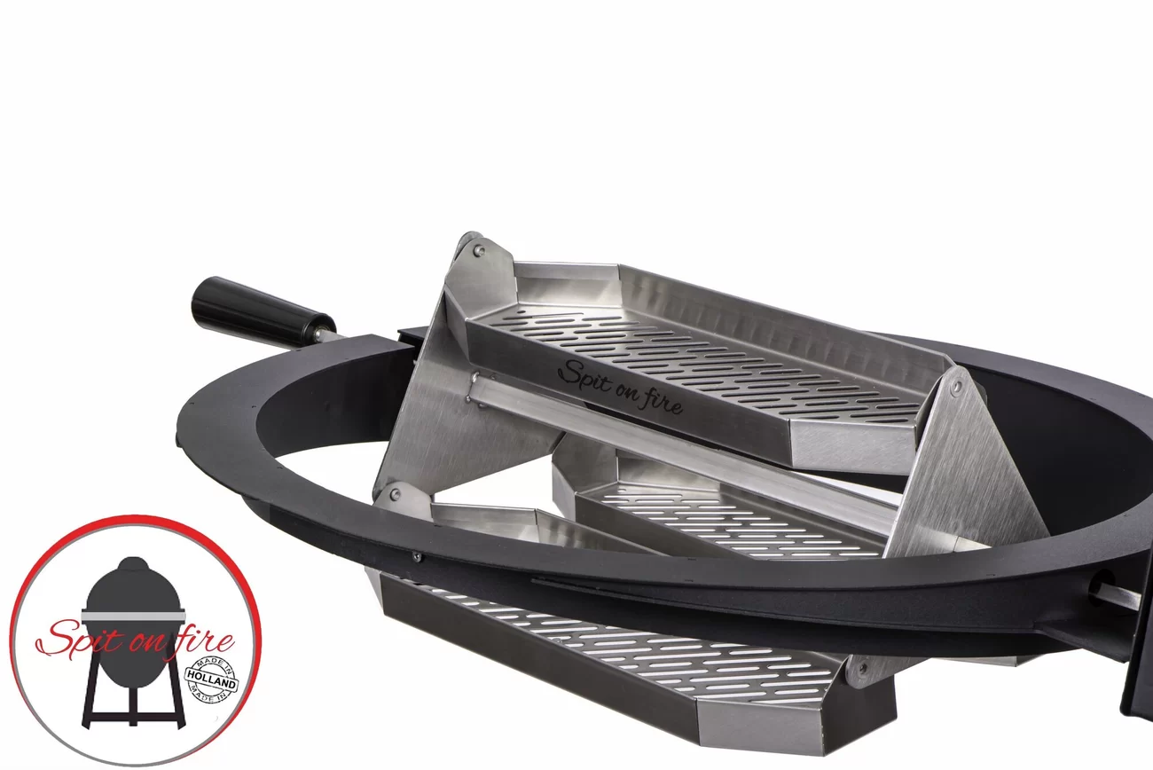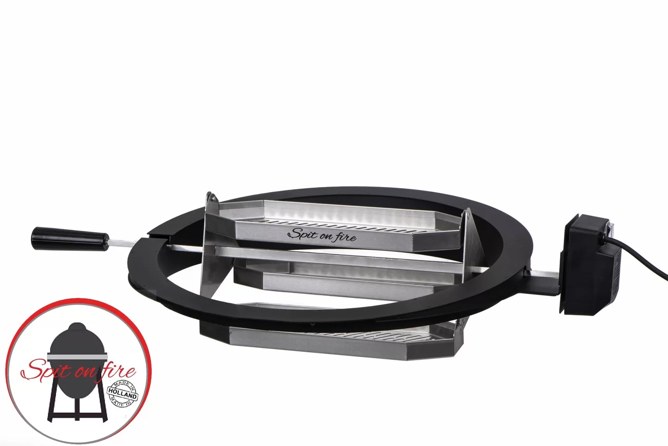 Rotisserie carrousel van The Spit on Fire geschikt voor alle draaispitten/rotisseries. De carrousel heeft drie horizontaal draaiende grillmanden en is volledig gemaakt van RVS. De grillmanden draaien horizontaal door de kamado, waardoor de gerechten veel beter egaal gerookt en gegaard kunnen worden.