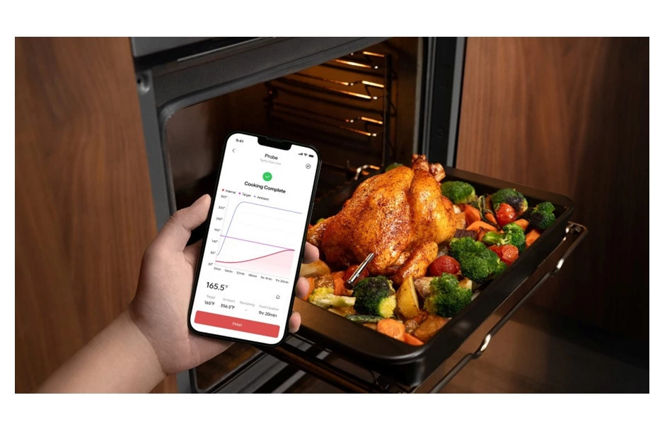 Een 6‑sensor sonde – De probe beschikt over vijf interne en één omgevingssensor. Dankzij een intelligent algoritme wordt automatisch de laagste kerntemperatuur gedetecteerd voor optimale gaarheid en perfecte resultaten, elke keer weer.