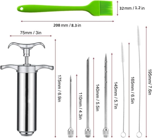 Marinade Injectiespuit van RVS met een silicone lakkwast om vlees, kip of ander gevogelte makkelijk met marinade in te spuiten. Hierdoor wordt de marinadetijd verkort en bereikt de marinade bovendien plekken die anders niet bereikt worden.