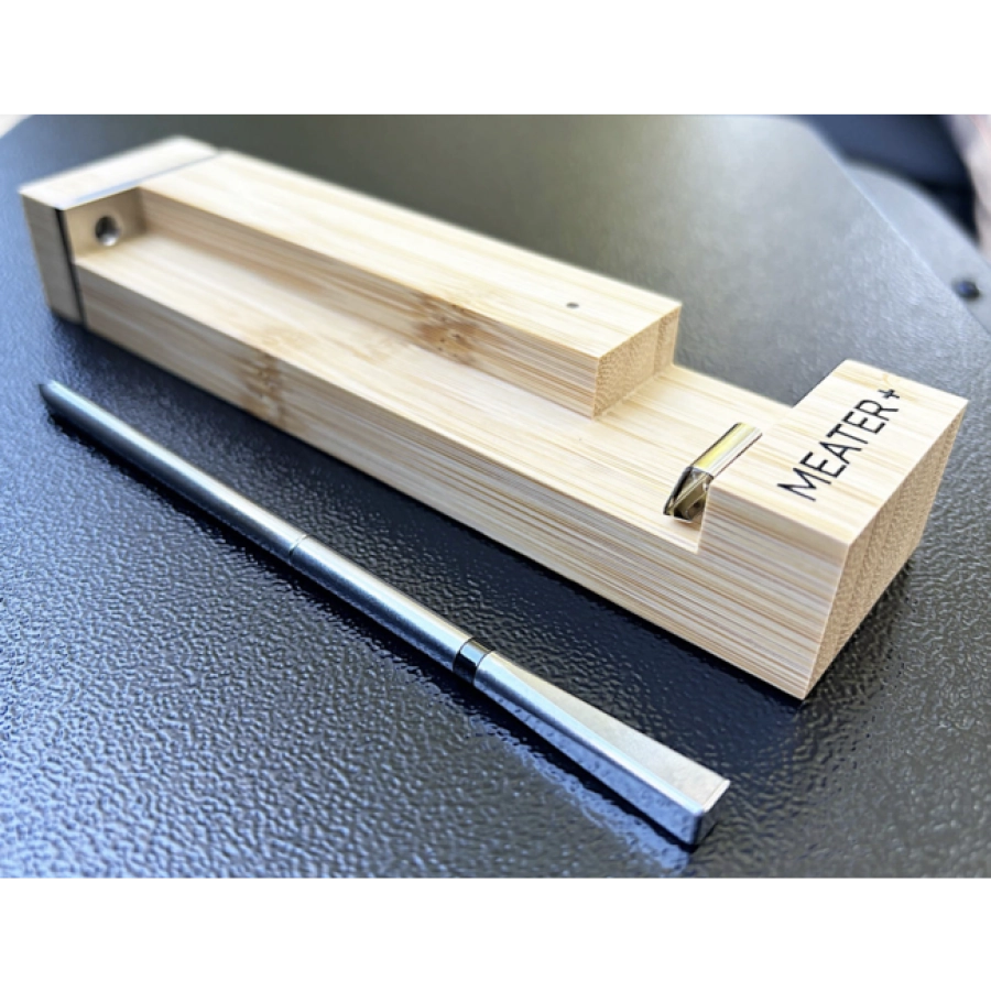 De houten houder is klein (157 x 23 x 37 mm) en dient ook als verbindingsbasis voor de probe. De houder is daarom ook voorzien van magneetjes voor het makkelijker plaatsen in de buurt van de probe.