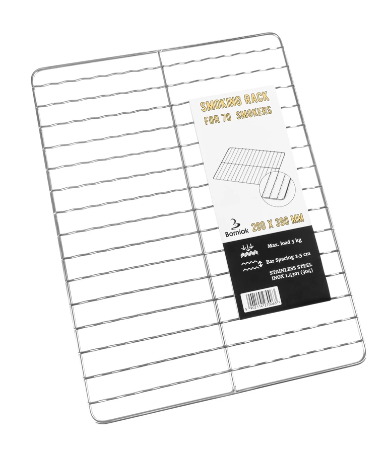 Een professioneel RVS rooster, perfect voor het plaatsen van worsten, vis, kaas en andere producten. Het plaatsen op dit rooster zorgt voor een goede ligging, terwijl de rook er goed omheen kan.