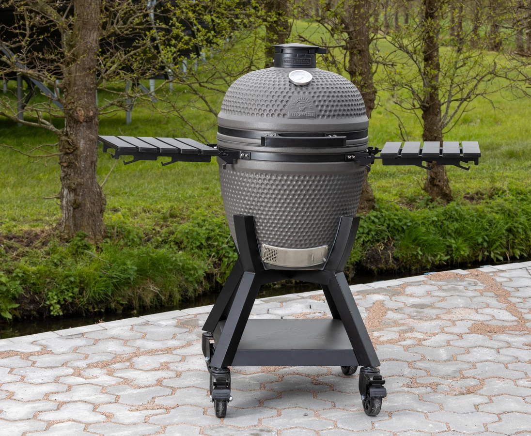 Het onderstel behoort tot de fraaiste op de markt en is een echte eyecatcher. Door de zeer stevige constructie en de extra grote wielen met een diameter van 13 centimeter verplaats je de kamado comfortabel in elke tuin.